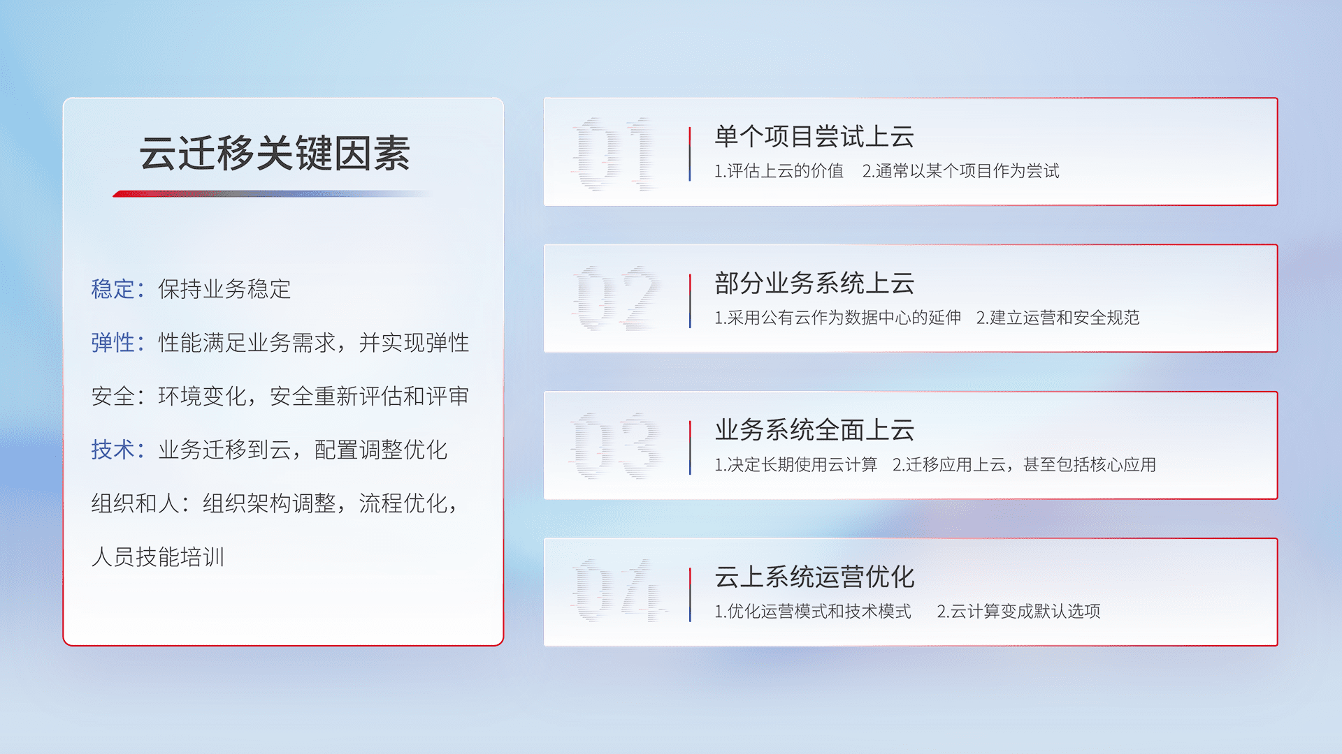 结合实际业务,,,,从规划设计、、、云平台选型、、、云原生改造、、、、数据迁移、、、、集成交付,,,迁移全过程为客户识别最佳上云路径,,,做好风险识别管理,,,,设计网络架构、、、身份权限、、、安全审计合规、、、、操作审计、、日志审计、、、、监控告警策略、、、多站点容灾设计等,,,对云上基础设施进行整体规划,,,,提升IT治理水平,,,以满足弹性、、、、高可用、、、高性能的需求。。。。
